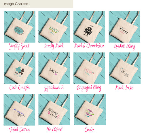 TOTE DESIGN SELECTIONS see additional photo: Choose from 12 Bridal Designs; Simply Sweet, Lovely Bride, Bridal Chandelier, Bridal Bling, Cute Couple, Signature 21, Engaged Bling, Bride to be, Violet Dance, Bridal Bling, He Asked and Curlz.