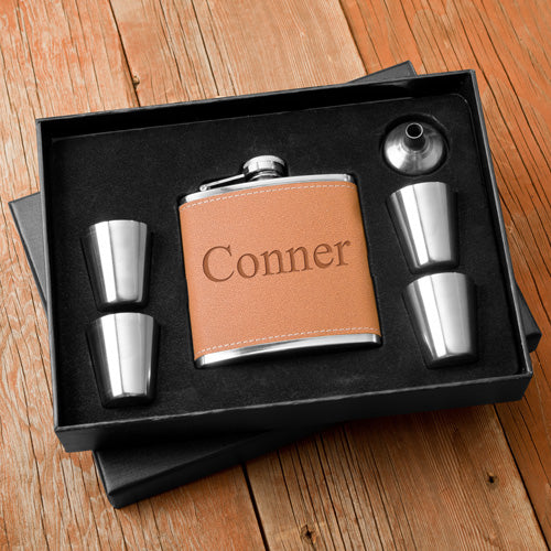 Personalized Hide Stitch Flask & Shot Glass Gift Box. This 6 oz. Flask set also comes with four shot glasses. Measures 3 1/2" x 3 3/4" x 3/4". Can be personalized with 2 lines up to 12 characters per line